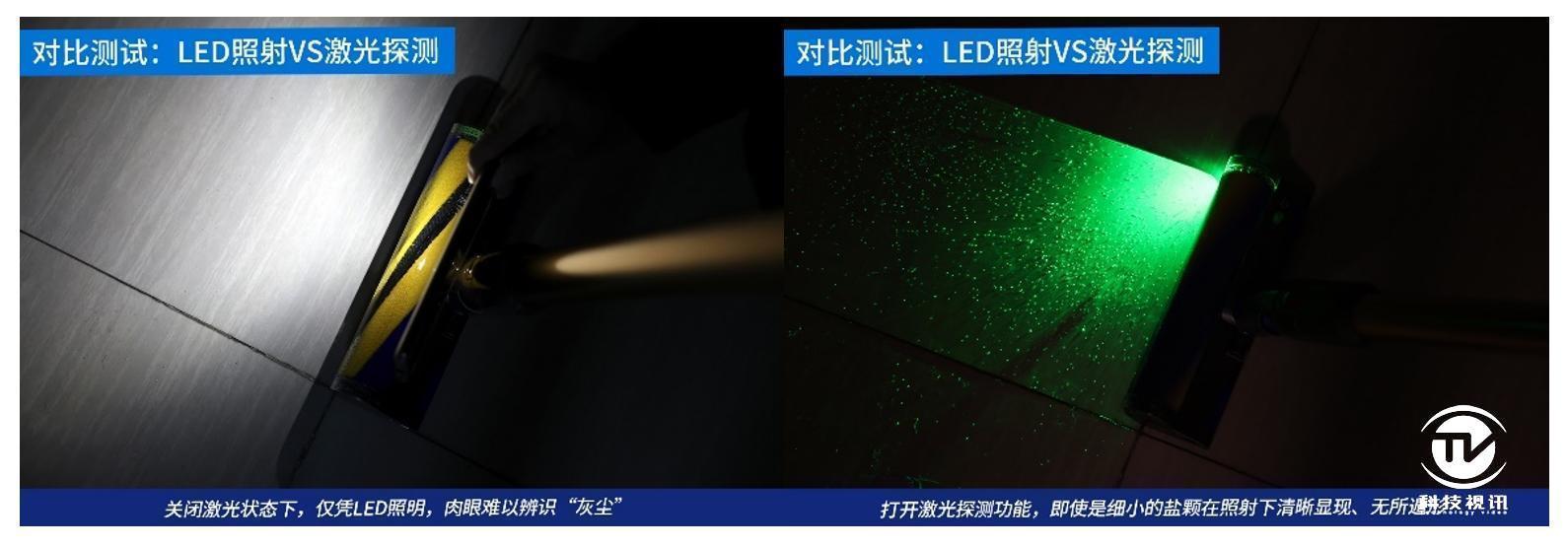 在V15 Detect 无绳吸尘器的纤巧软绒吸头上,戴森的工程师为其配备了激光探测技术,能在离地 7.3 毫米的高度,以向下 1.5°的精准角度,从刷条的底部照射而出,使灰尘阴影与地面形成鲜明对比,让肉眼不易见的微小颗粒在绿色激光的照射下清晰显现,避免用户对于灰尘的遗漏或者反复清洁。